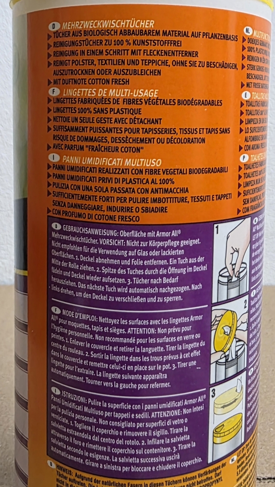 Hinweis: Reinigungstücher vorsichtig verwenden. Vor Gebrauch stets Etikett und Produktinformationen lesen.