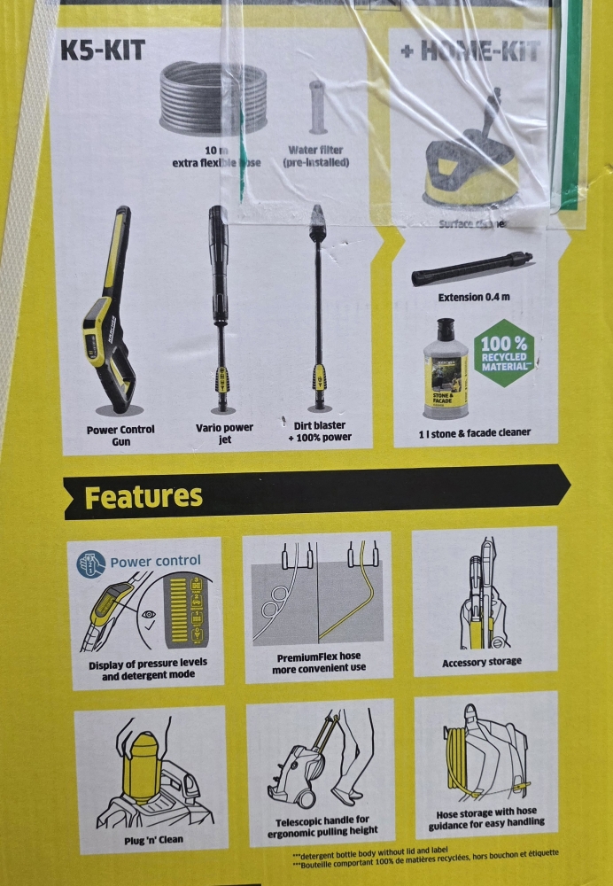 Lieferung: inkl. Hochdruckreiniger, Flächenreiniger T5, Stein- und Fassadenreiniger 1 Liter, Hochdruckpistole G 160 Q Power Control, Hochdruckschlauch PremiumFlex 10m, Vario Power Jet Strahlrohr, Dreckfräser, Adapter Gartenschlauchanschluss A3/4"