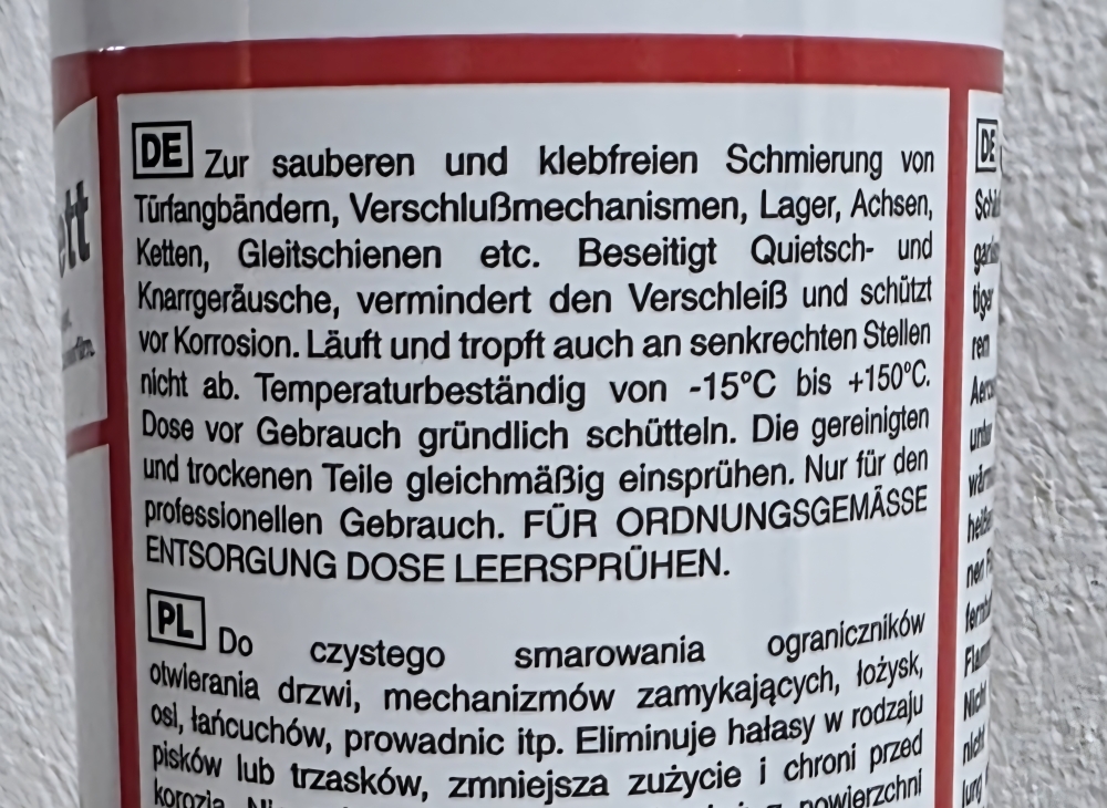 | Materialeigenschaften: | wasserbeständig, rostlösend, schleuderfest, säurefrei |